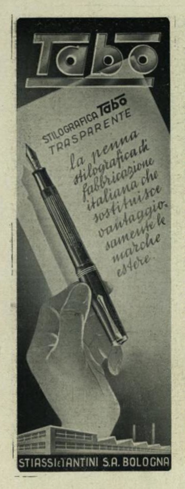 Scanning of advertising from Tabo (a Stiassi e Tantini trademark) dated 1942-11-29. Published on: L'Illustrazione Italiana, year LXIX, n. 48. Retouched by the author for a better sharpness. Dating established by finding the page in an archived version of the magazine. Published also on: N. 51 (1942-12-20), N. 52 (1942-12-27); year LXX, N. 1 (1943-01-03), N. 2 (1943-01-10), N. 3 (1943-01-17), N. 4 (1943-01-24), N. 5 (1943-01-31), N. 6 (1943-03-07), N. 7 (1943-03-14). Advertising for the Trasparente model.