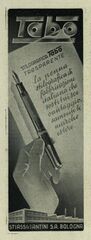 Scansione di una pubblicità Tabo (un marchio della Stiassi e Tantini) datata 1942-11-29. Pubblicazione su: L'Illustrazione Italiana, anno LXIX, n. 48. Ritoccata dall'autore per una migliore nitidezza. Data dal reperimento della pagina su una versione archiviata della rivista. Pubblicata anche su: N. 51 (1942-12-20), N. 52 (1942-12-27); anno LXX, N. 1 (1943-01-03), N. 2 (1943-01-10), N. 3 (1943-01-17), N. 4 (1943-01-24), N. 5 (1943-01-31), N. 6 (1943-03-07), N. 7 (1943-03-14). Pubblicizza il modello Trasparente.
