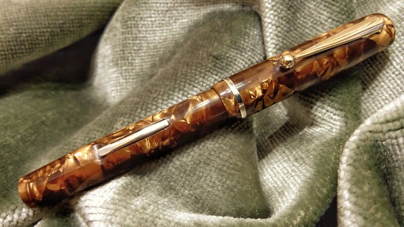 Foto di una penna Artcraf. Caricamento a levetta. Realizzazione in celluloide marmorizzata marrone. Modello non identificato. Contributo di Gustavo, (utente forum gfrico2000).