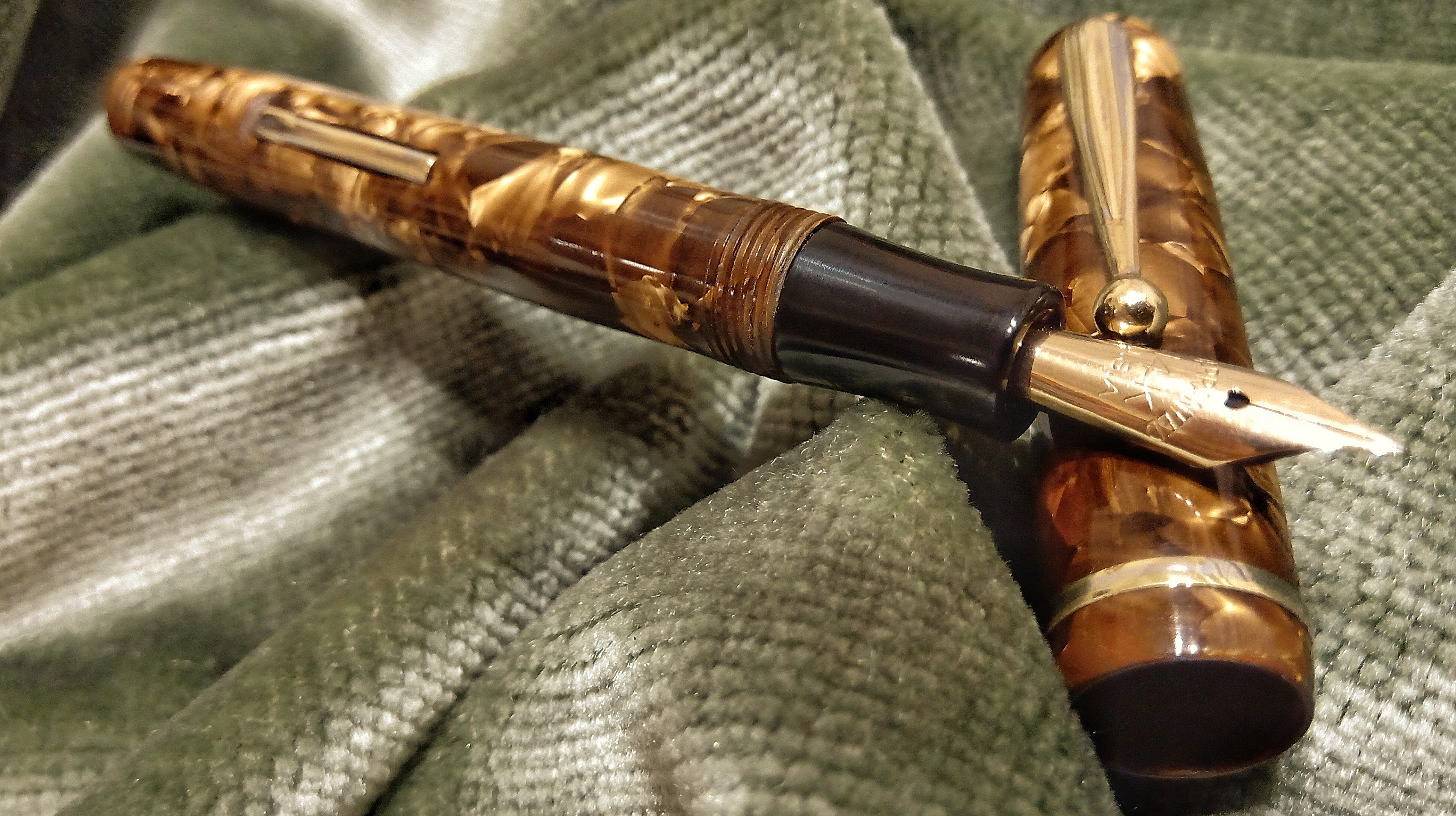 Foto di una penna Artcraf. Caricamento a levetta. Realizzazione in celluloide marmorizzata marrone. Modello non identificato. Contributo di Gustavo, (utente forum gfrico2000).