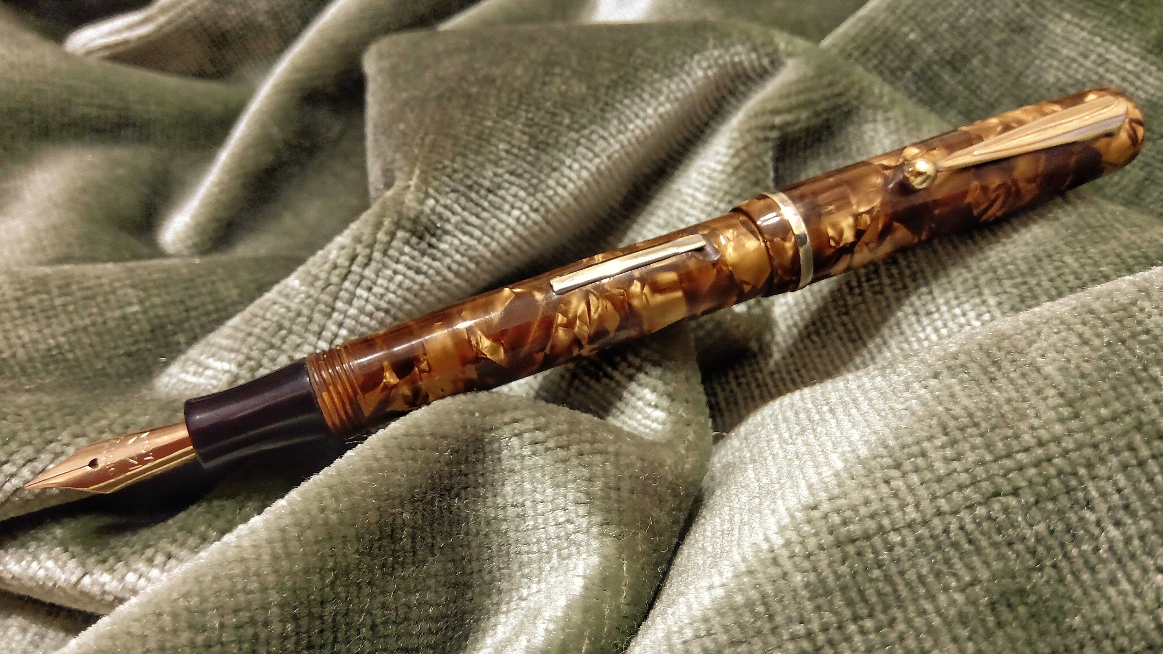 Foto di una penna Artcraf. Caricamento a levetta. Realizzazione in celluloide marmorizzata marrone. Modello non identificato. Contributo di Gustavo, (utente forum gfrico2000).