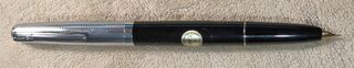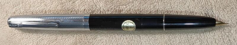 Photo of a pen produced by Artus (a Lamy trademark). Model: Artus 51f. Filling system: piston filler. In black plastic resin. Hooded nib model (FK size) with chromed cap.