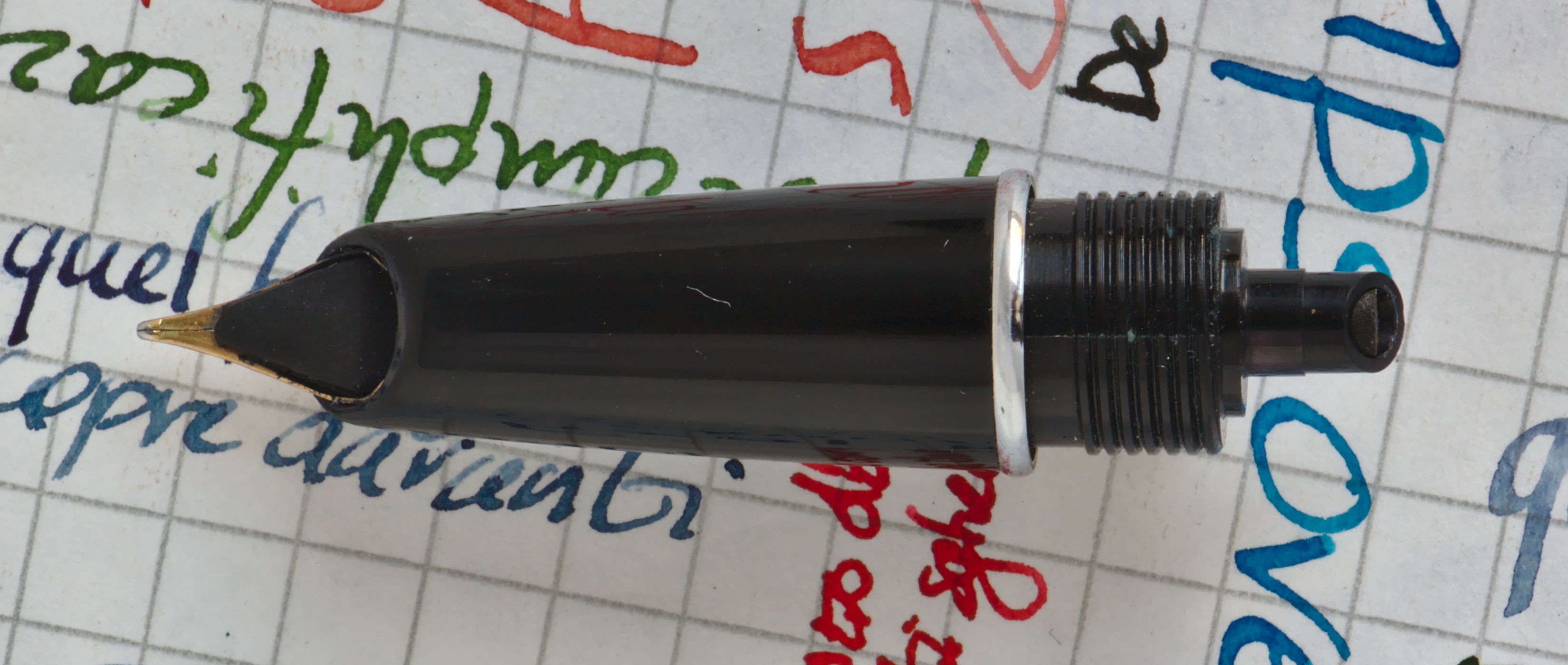 Foto di una penna Aurora. Modello: 2cart. Caricamento a cartuccia. Realizzazione in resina plastica nera. Dettaglio dell'alimentatore. Versione ordinaria.