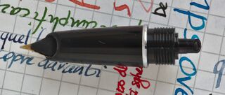 Photo of a pen produced by Aurora. Model: 2cart. Filling system: cartridge filler. In black plastic resin. Detail of feeder. Standard version.