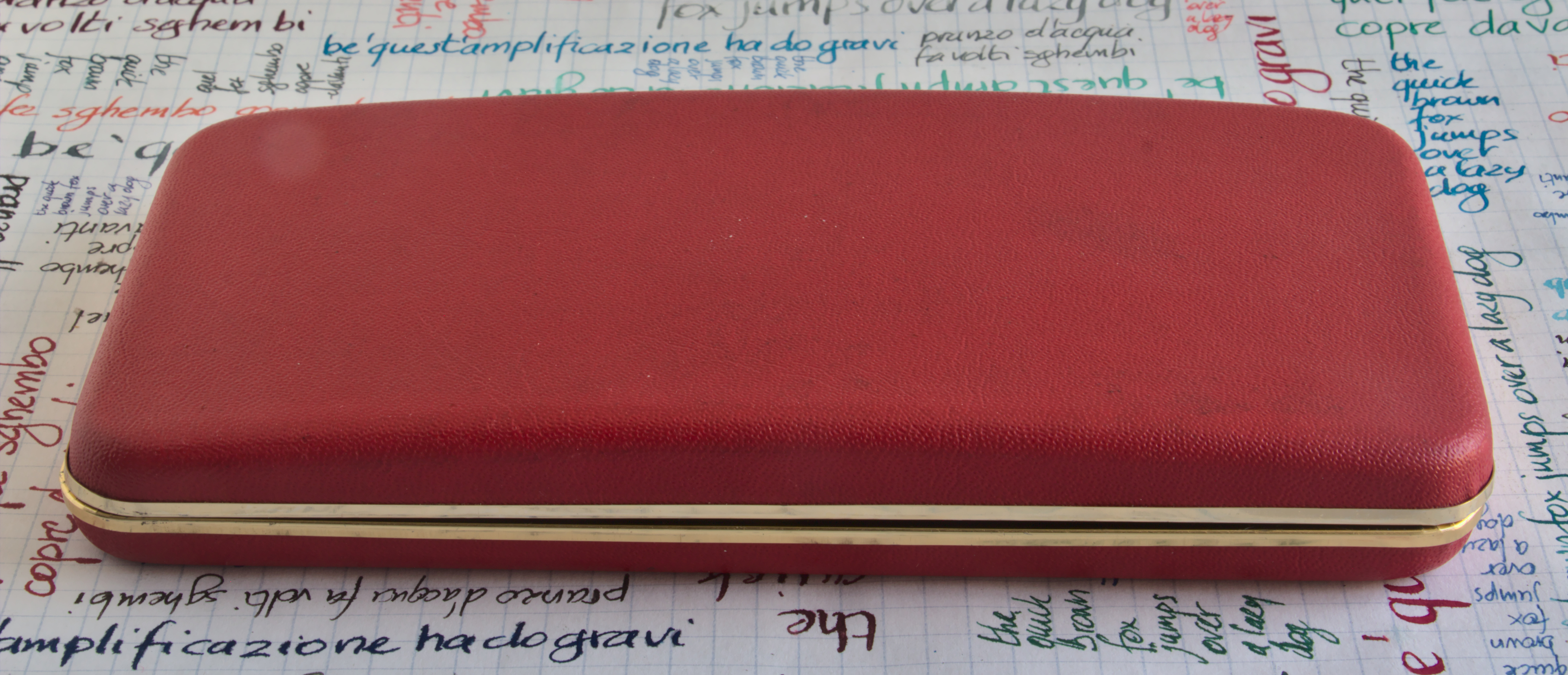 Photo of a pen/pencil set produced by Aurora. Model: Aurora 88K. Filling system: piston filler. In black celluloid. Detail of box. Chromed cap version with black head screw. Serial 2156941.