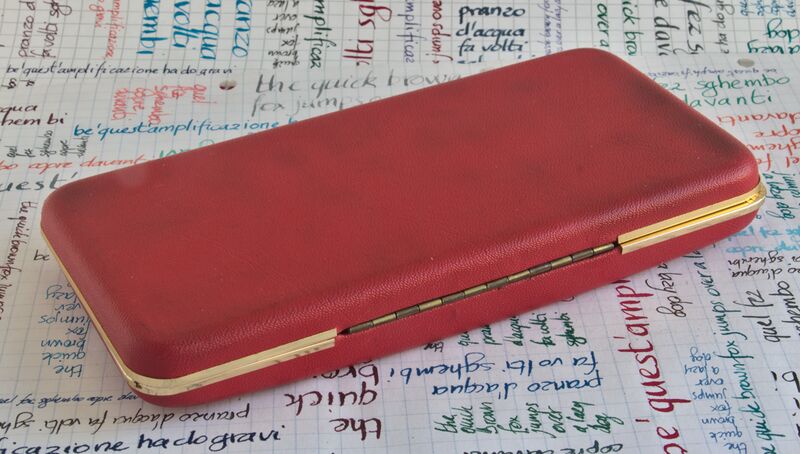 Photo of a pen/pencil set produced by Aurora. Model: Aurora 88K. Filling system: piston filler. In black celluloid. Detail of box. Chromed cap version with black head screw. Serial 2156941.