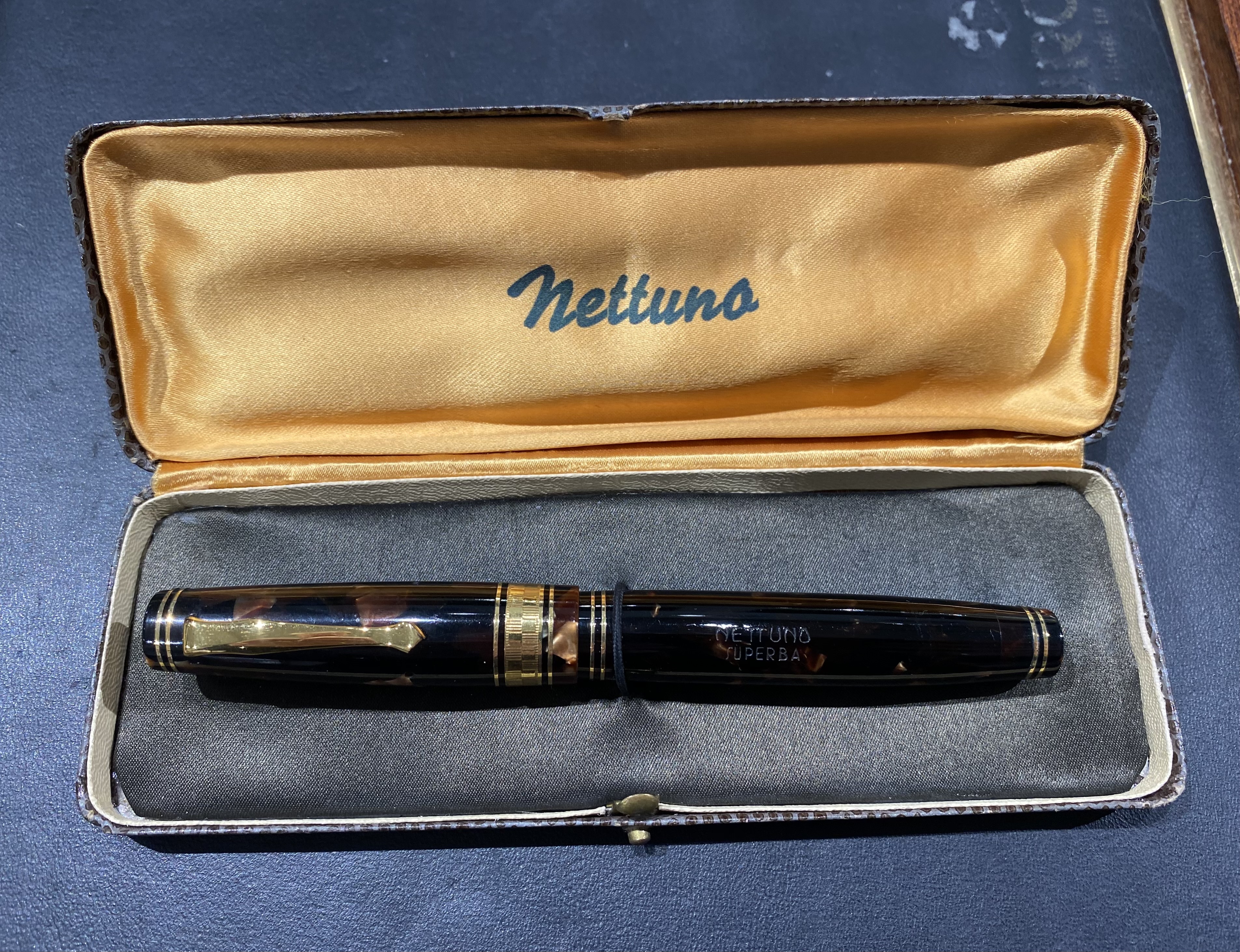 Foto di una penna Nettuno. Modello: Nettuno Superba. Caricamento a pulsante di fondo. Realizzazione in celluloide marmorizzata marrone. Versione grande, con clip lanceolata, successiva alla prima versione, pennino oro marcato 585. Contributo di Giuliano, (utente forum Giu1963).