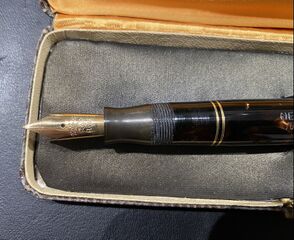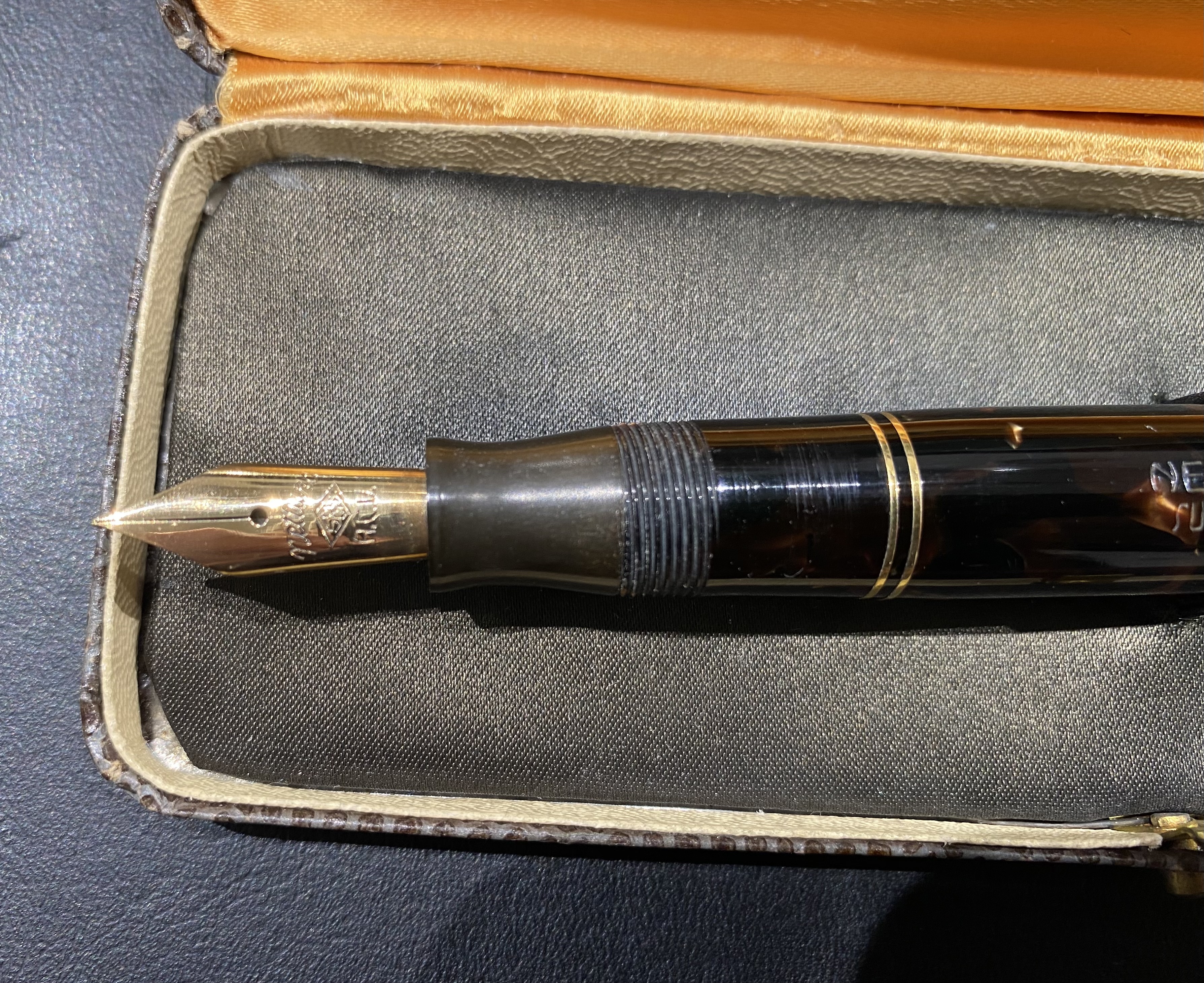 Foto di una penna Nettuno. Modello: Nettuno Superba. Caricamento a pulsante di fondo. Realizzazione in celluloide marmorizzata marrone. Versione grande, con clip lanceolata, successiva alla prima versione, pennino oro marcato 585. Contributo di Giuliano, (utente forum Giu1963).