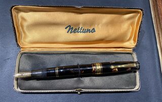 Foto di una penna Nettuno. Modello: Nettuno Superba. Caricamento a pulsante di fondo. Realizzazione in celluloide marmorizzata marrone. Versione grande, con clip lanceolata, successiva alla prima versione, pennino oro marcato 585. Contributo di Giuliano, (utente forum Giu1963).