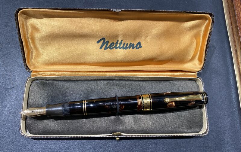 Photo of a pen produced by Nettuno. Model: Nettuno Superba. Filling system: button filler. In brown marbled celluloid. Big size version, with lance-shaped clip, posterior to the first version, gold nib marked 585.