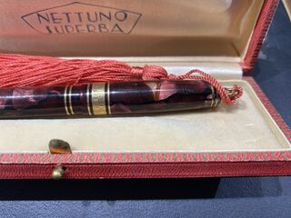 Foto di una penna Nettuno. Modello: Nettuno Superba. Caricamento a pulsante di fondo. Realizzazione in celluloide marmorizzata rossa. Versione da signora. Contributo di Giuliano, (utente forum Giu1963).
