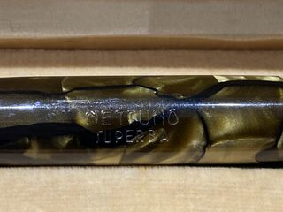 Foto di una penna Nettuno. Modello: Nettuno Superba. Caricamento a pulsante di fondo. Realizzazione in celluloide marmorizzata verde. Dettaglio della stampigliatura. Versione di taglia media, con clip lanceolata, successiva alla prima versione e pennino in acciaio con il logo del tridente del Nettuno. Contributo di Giuliano, (utente forum Giu1963).