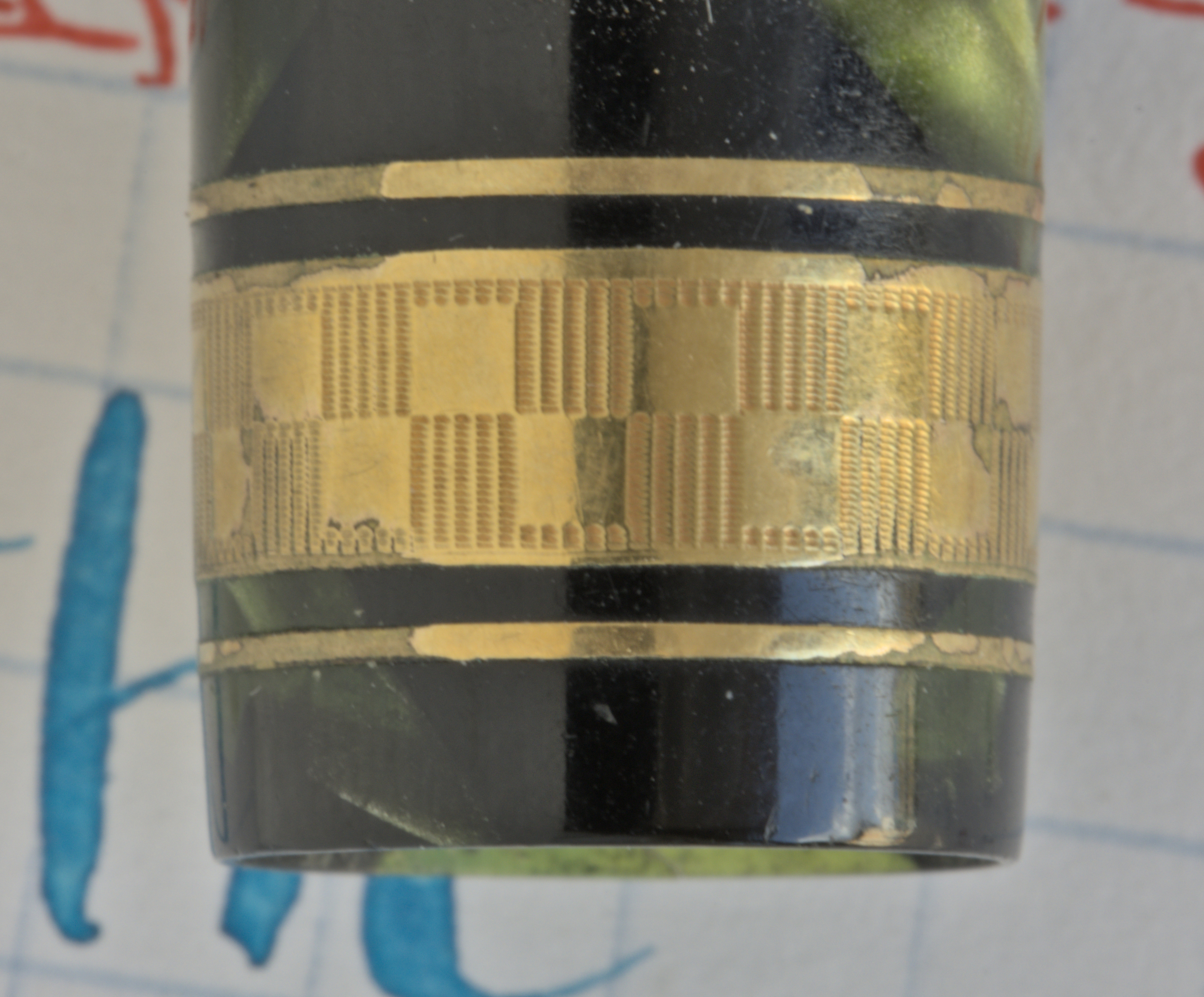Photo of a pen produced by Nettuno. Model: Nettuno Superba. Filling system: button filler. In green marbled celluloid. Detail of band. Big size version.