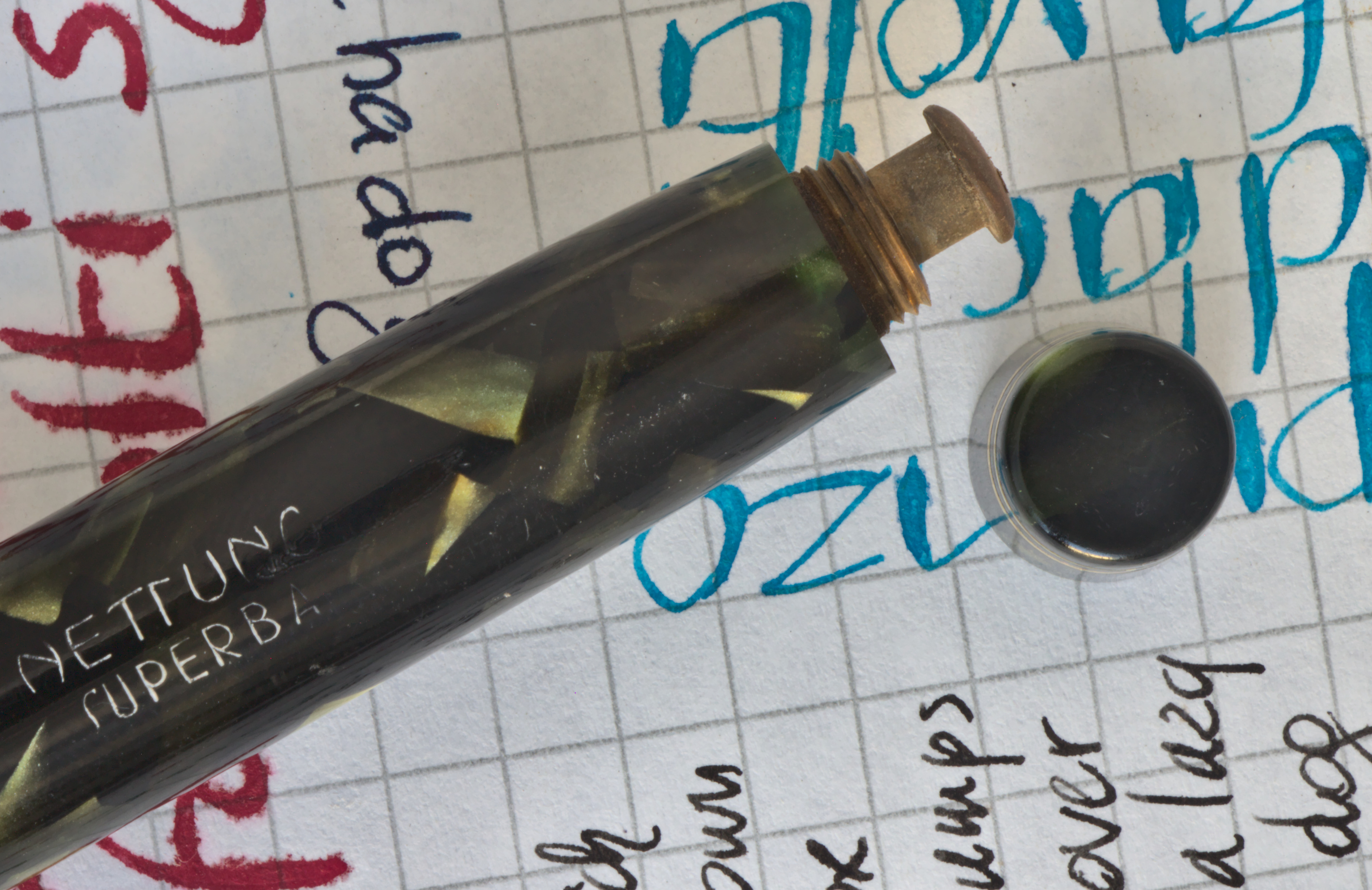 Foto di una penna Nettuno. Modello: Nettuno Superba. Caricamento a pulsante di fondo. Realizzazione in celluloide marmorizzata verde. Dettaglio del tappo posteriore. Dettaglio del caricamento. Versione grande.