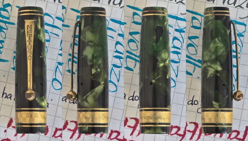 Foto di una penna Nettuno. Modello: Nettuno Superba. Caricamento a pulsante di fondo. Realizzazione in celluloide marmorizzata verde. Dettaglio del cappuccio. Versione grande.