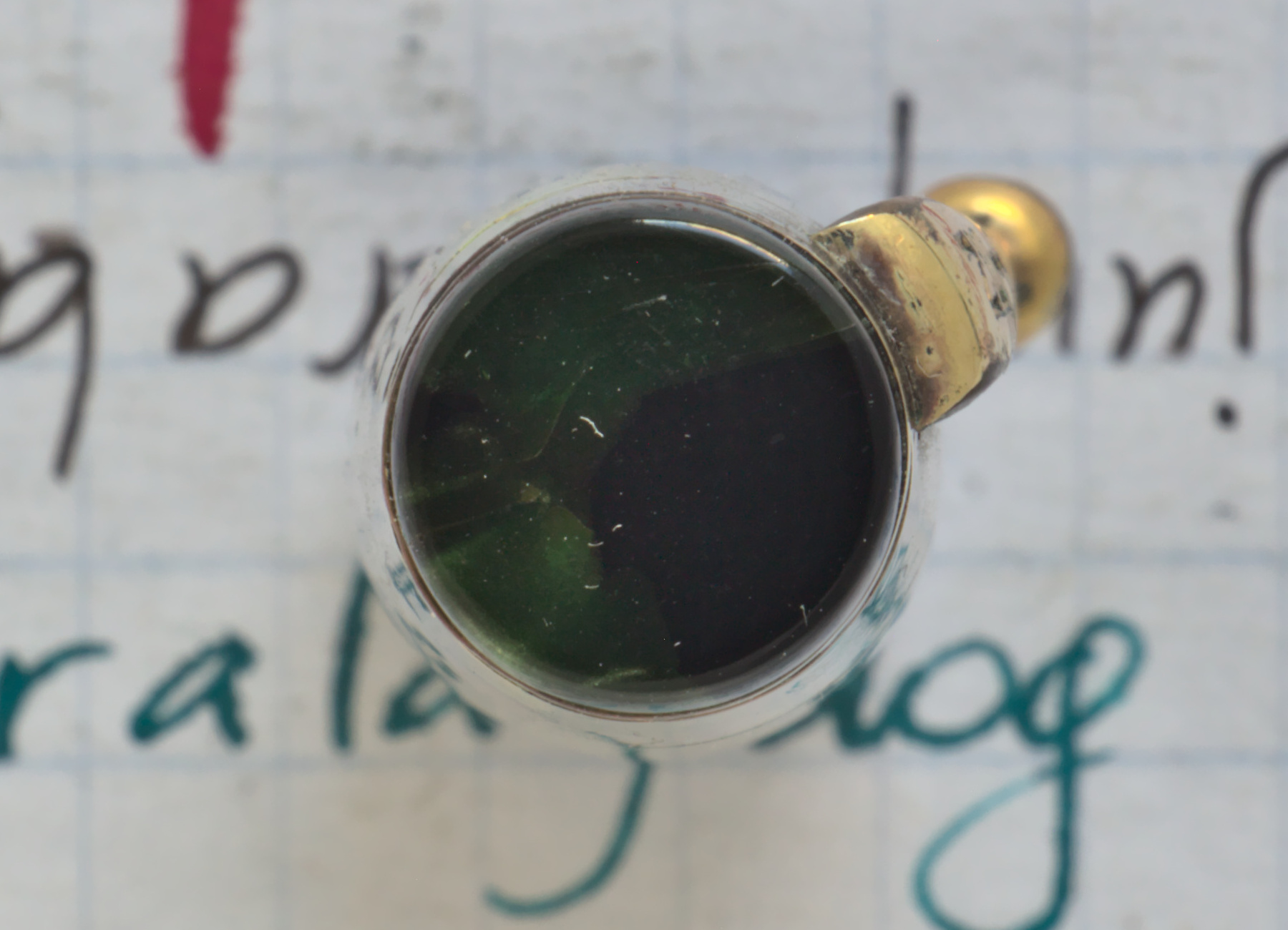 Photo of a pen produced by Nettuno. Model: Nettuno Superba. Filling system: button filler. In green marbled celluloid. Detail of cap head. Big size version.