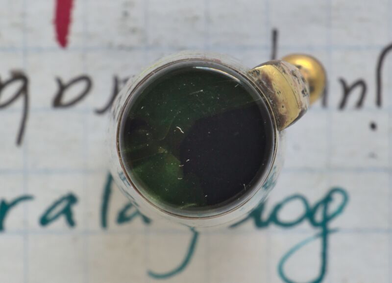 Foto di una penna Nettuno. Modello: Nettuno Superba. Caricamento a pulsante di fondo. Realizzazione in celluloide marmorizzata verde. Dettaglio della testa del cappuccio. Versione grande.