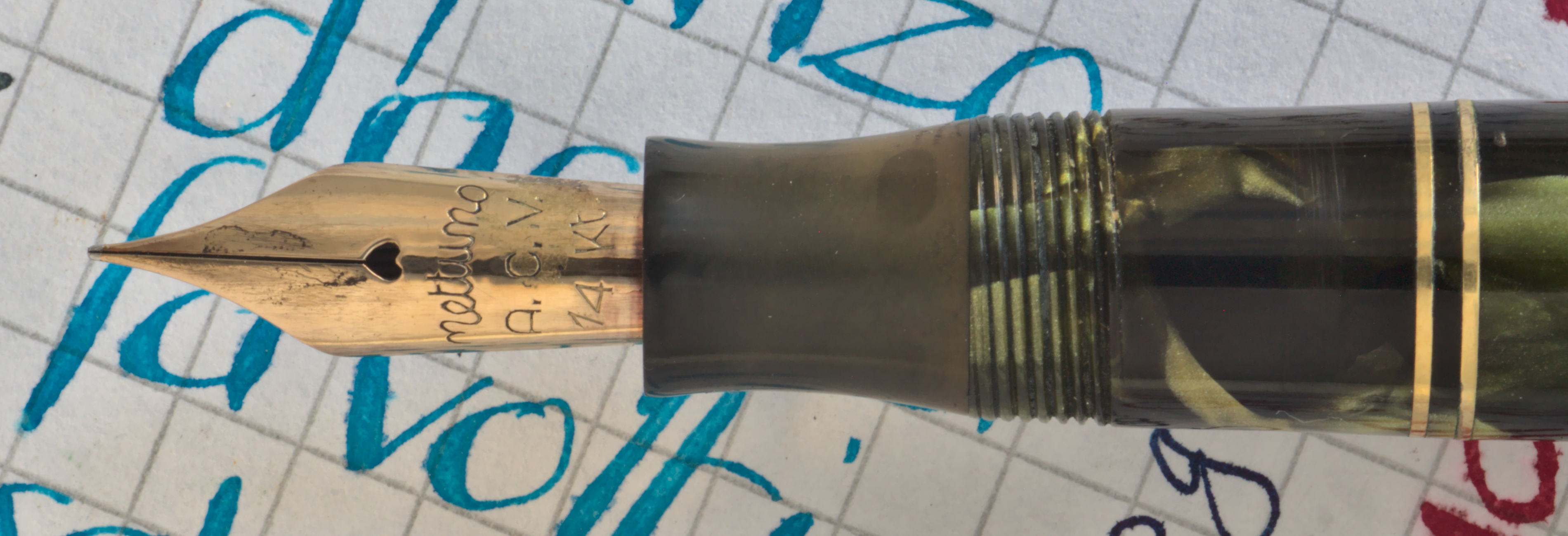 Photo of a pen produced by Nettuno. Model: Nettuno Superba. Filling system: button filler. In green marbled celluloid. Detail of nib. Big size version.