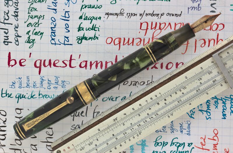 Foto di una penna Nettuno. Modello: Nettuno Superba. Caricamento a pulsante di fondo. Realizzazione in celluloide marmorizzata verde. Versione grande.