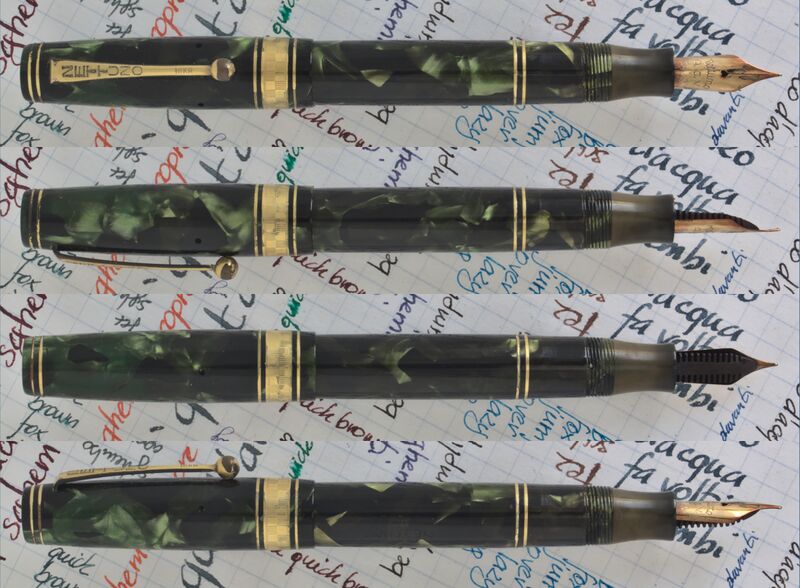 Foto di una penna Nettuno. Modello: Nettuno Superba. Caricamento a pulsante di fondo. Realizzazione in celluloide marmorizzata verde. Versione grande.