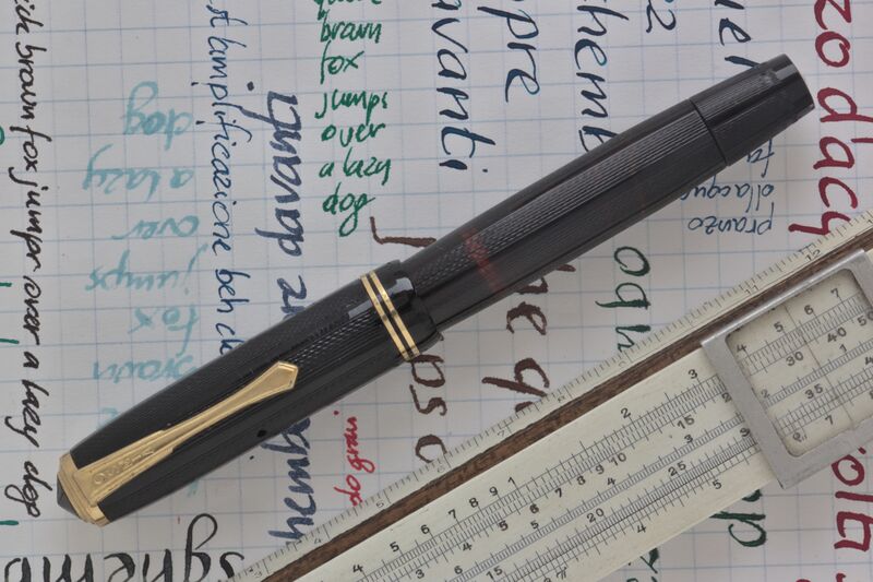 Photo of a pen produced by Osmia. Model: Osmia 64G. Filling system: piston filler. In black chased celluloid. Pen with #4 nib.