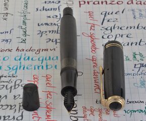 Photo of a pen produced by Osmia. Model: Osmia 64G. Filling system: piston filler. In black chased celluloid. Pen with #4 nib.