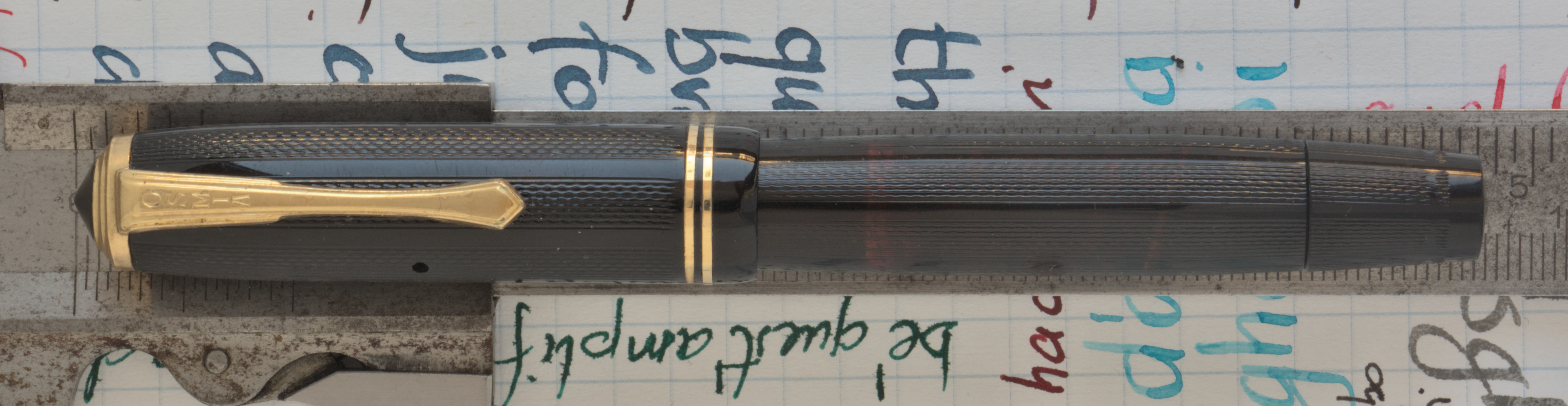 Photo of a pen produced by Osmia. Model: Osmia 64G. Filling system: piston filler. In black chased celluloid. Pen with #4 nib.