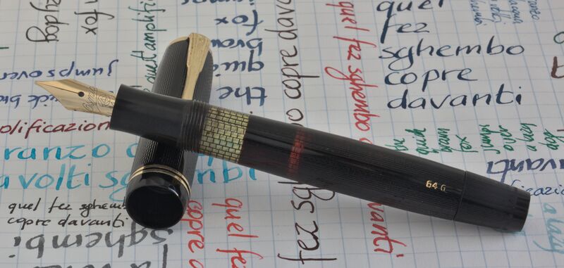 Photo of a pen produced by Osmia. Model: Osmia 64G. Filling system: piston filler. In black chased celluloid. Pen with #4 nib.