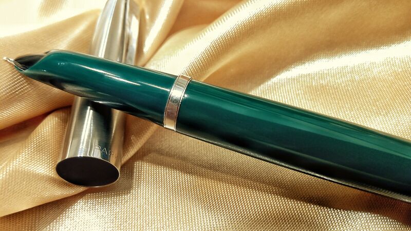 Photo of a pen produced by Parker. Model: Parker 21. Filling system: Aerometric. In green plastic resin. Mark I version.