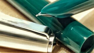 Photo of a pen produced by Parker. Model: Parker 21. Filling system: Aerometric. In green plastic resin. Detail of cap head. Detail of nib. Mark I version.