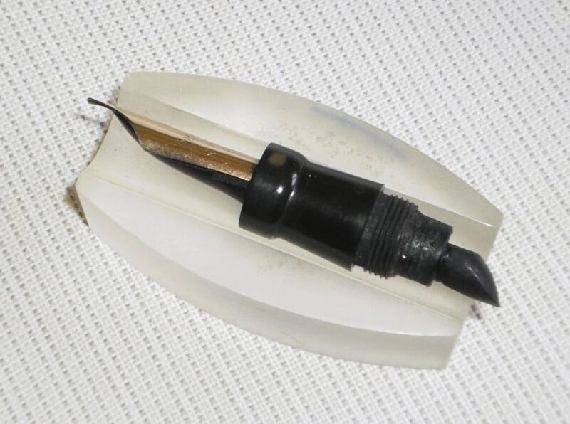 Photo of a pen produced by Parker. Model: Duofold. Photo of the nib group showing the Lucky Curve feeder.