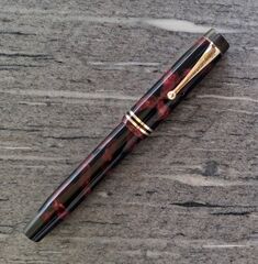 Photo of a pen produced by Parker. Model: Duofold. Filling system: button filler. In Burgundy and Black marbled celluloid. Streamlined version, two rings, Junior size.