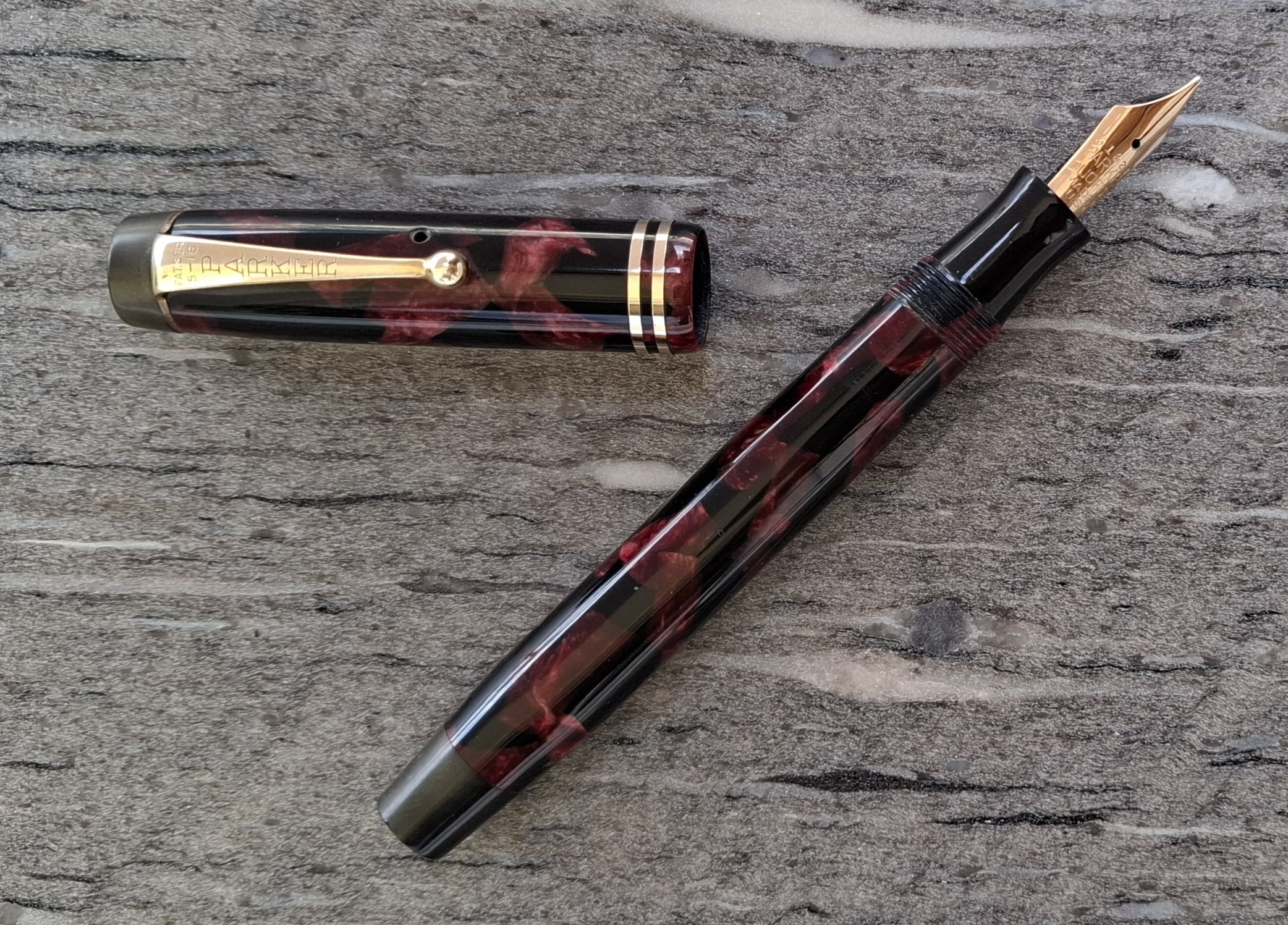 Foto di una penna Parker. Modello: Duofold. Caricamento a pulsante di fondo. Realizzazione in celluloide marmorizzata borgogna e nero. Versione affusolata con due verette, misura Junior. Contributo di Giorgio (utente forum Musicus).