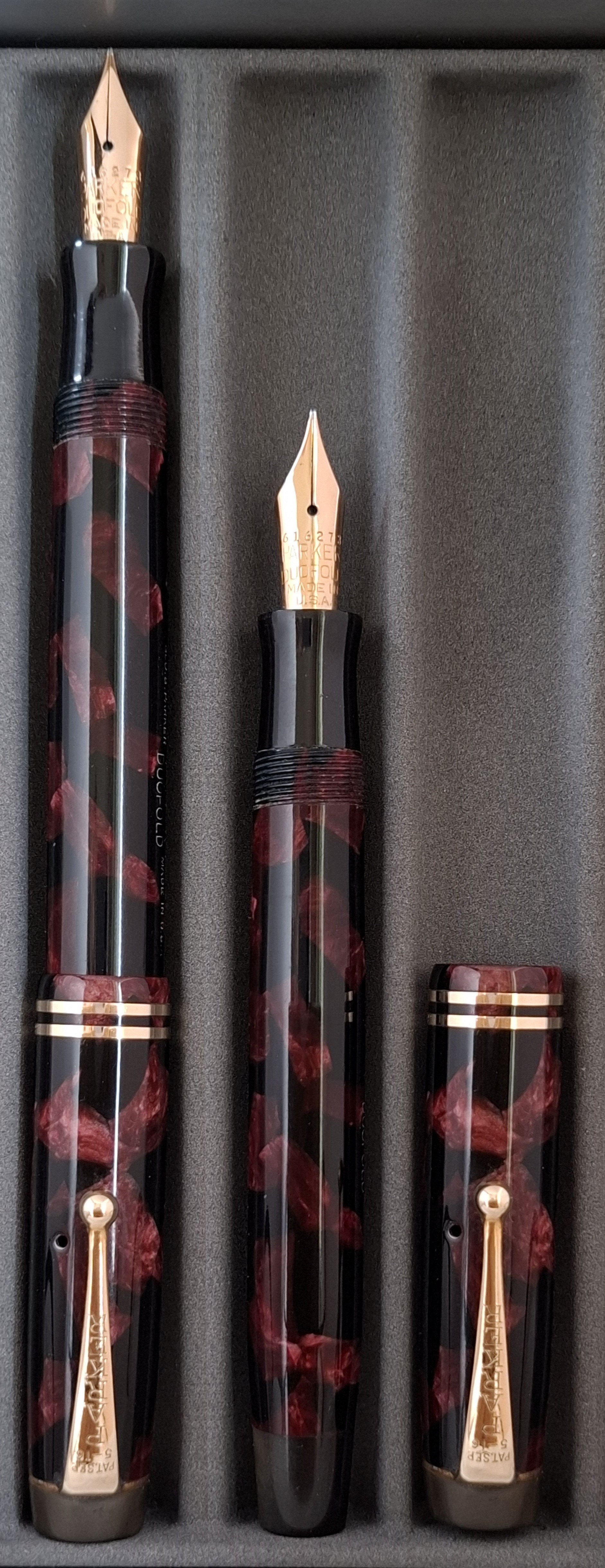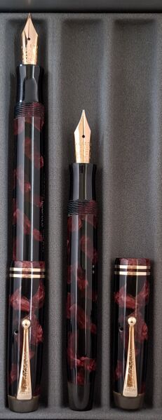Foto di una penna Parker. Modello: Duofold. Caricamento a pulsante di fondo. Realizzazione in celluloide marmorizzata borgogna e nero. Versione affusolata con due verette, misura Junior. Contributo di Giorgio (utente forum Musicus).
