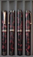 Foto di una penna Parker. Modello: Duofold. Caricamento a pulsante di fondo. Realizzazione in celluloide marmorizzata borgogna e nero. Versione affusolata con due verette, misura Junior. Contributo di Giorgio (utente forum Musicus).