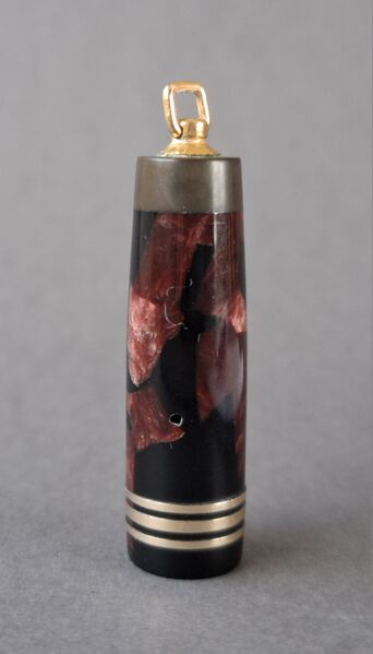 Photo of a pen produced by Parker. Model: Duofold. Filling system: button filler. In Burgundy and Black marbled celluloid. Detail of cap. Vest pocket version.