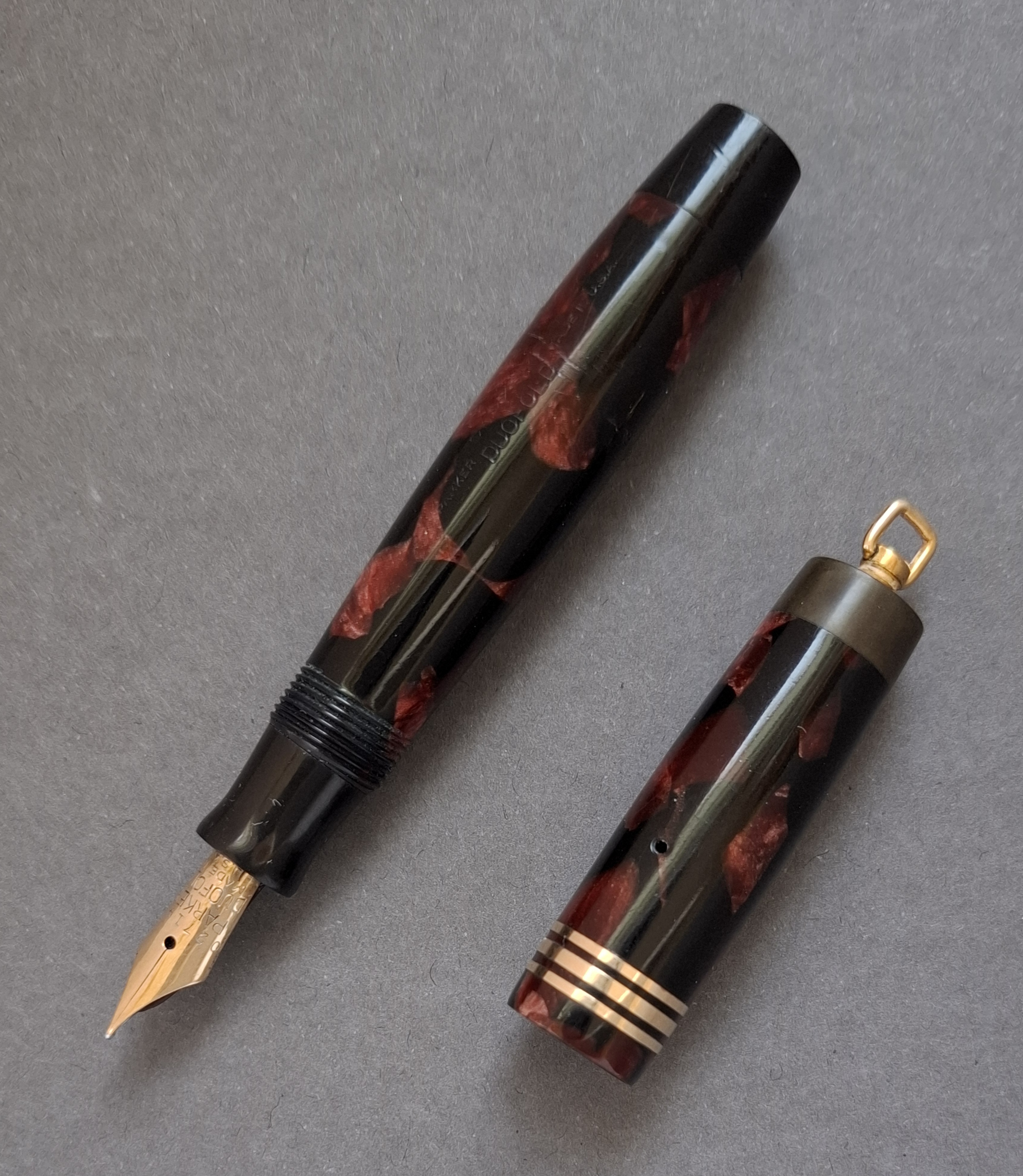 Foto di una penna Parker. Modello: Duofold. Caricamento a pulsante di fondo. Realizzazione in celluloide marmorizzata borgogna e nero. Versione Vest pocket. Contributo di Giorgio (utente forum Musicus).