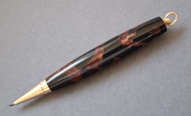 Foto di una matita meccanica Parker. Modello: Duofold. Realizzazione in celluloide marmorizzata borgogna e nero. Versione vest pocket. Contributo di Giorgio (utente forum Musicus).