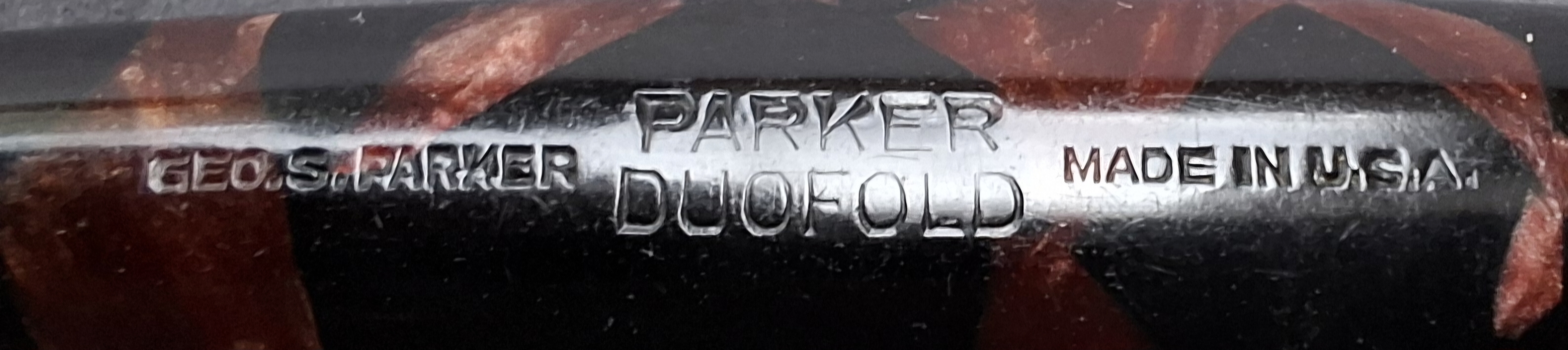 Foto di una matita meccanica Parker. Modello: Duofold. Caricamento a pulsante di fondo. Realizzazione in celluloide marmorizzata borgogna e nero. Dettaglio della stampigliatura. Versione vest pocket. Contributo di Giorgio (utente forum Musicus).