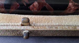 Photo of a pen/pencil set produced by Parker. Model: Duofold. Filling system: button filler. In Burgundy and Black marbled celluloid. Detail of box. Vest pocket version.
