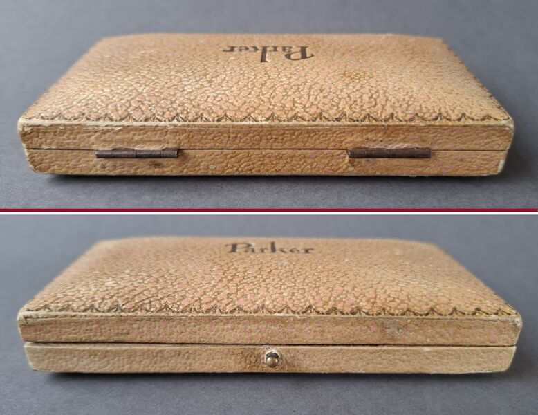 Photo of a pen/pencil set produced by Parker. Model: Duofold. Filling system: button filler. In Burgundy and Black marbled celluloid. Detail of box. Vest pocket version.