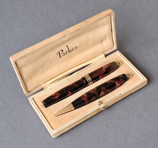 Photo of a pen/pencil set produced by Parker. Model: Duofold. Filling system: button filler. In Burgundy and Black marbled celluloid. Vest pocket version.