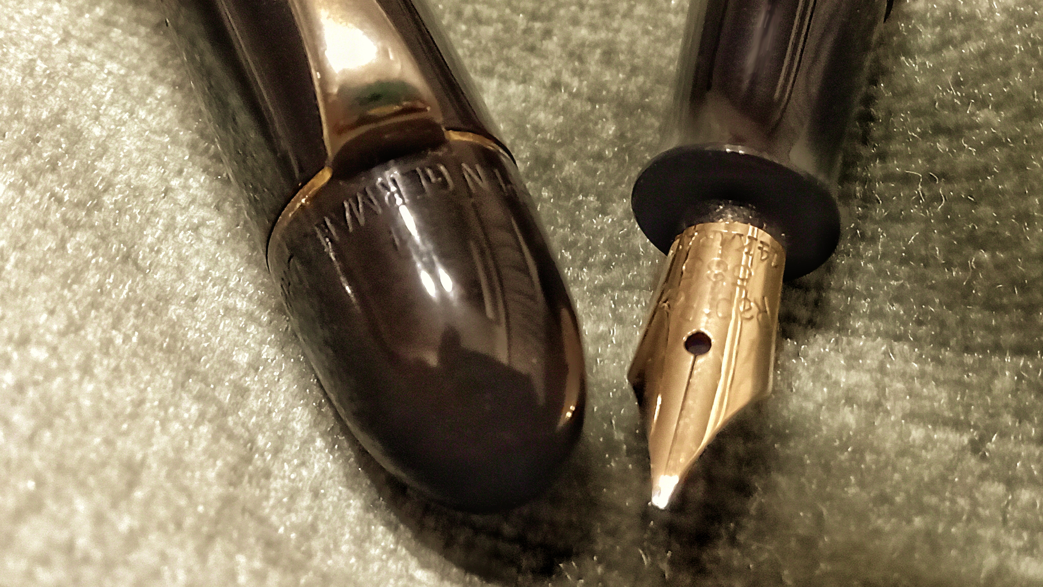 Foto di una penna Pelikan. Modello: Rappen. Caricamento a stantuffo. Realizzazione in celluloide nera. Dettaglio della testa del cappuccio. Dettaglio del pennino. Versione successiva con caricamento a stantuffo. Contributo di Gustavo, (utente forum gfrico2000).
