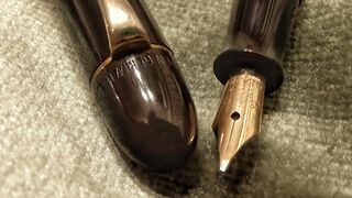 Photo of a pen produced by Pelikan. Model: Rappen. Filling system: piston filler. In black celluloid. Detail of cap head. Detail of nib. Later piston filler version.