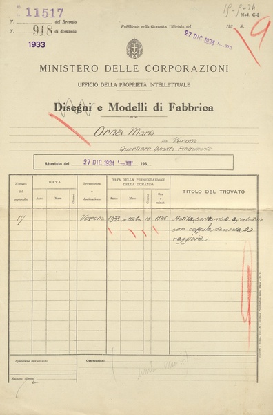Privativa industriale per un modello di fabbrica della Orna. Testo descrittivo della registrazione: "Matita porta-mina a serbatoio con capsula decorata a raggiera".