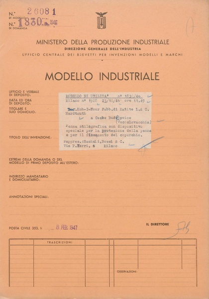 Privativa industriale per un modello di utilità della Hardtmuth. Testo descrittivo della registrazione: "Penna stilografica con dispositivo speciale per la protezione della penna e per il fissamento del coperchio".