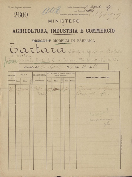 Privativa industriale per un modello di fabbrica. Testo descrittivo della registrazione: "Penna a serbatoio di forma appiattita".