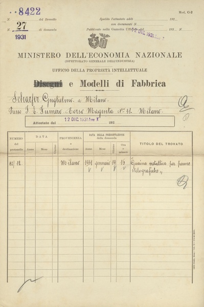 | attuale | 22:40, 2 set 2025 | 4 158 × 6 247, 5 pagine (2,74 MB) | Piccardi (discussione | contributi) | == Dettagli == {{InfoModello |Numero=8422 |Data=1931-12-12 |Richiesto=1931-01-19 |Marca=Kosca |Titolare=Guglielmo Schaefer |Tipo=di fabbrica |Titolo=Guaina metallica per penne stilografiche |Domanda=27 |Ufficio=Milano |Fonte=[https://tecadigitaleacs.cultura.gov.it/media/ricercadl?rictree=MINISTERO+DELL%27INDUSTRIA%2c+DEL+COMMERCIO+E+DELL%27ARTIGIANATO%2fUFFICIO+ITALIANO+BREVETTI+E+MARCHI%2fArchivio+generale%2fModelli%2fBrevetti+dal+n.+1+al+n.+100.000 Archivio Centrale dallo Stato] |Note=Attri... |
