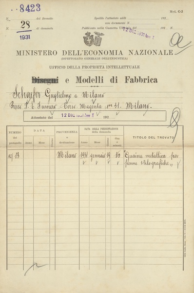 | attuale | 22:43, 2 set 2025 | 4 147 × 6 250, 5 pagine (2,74 MB) | Piccardi (discussione | contributi) | == Dettagli == {{InfoModello |Numero=8423 |Data=1931-12-12 |Richiesto=1931-01-19 |Marca=Kosca |Titolare=Guglielmo Schaefer |Tipo=di fabbrica |Titolo=Guaina metallica per penne stilografiche |Domanda=28 |Ufficio=Milano |Fonte=[https://tecadigitaleacs.cultura.gov.it/media/ricercadl?rictree=MINISTERO+DELL%27INDUSTRIA%2c+DEL+COMMERCIO+E+DELL%27ARTIGIANATO%2fUFFICIO+ITALIANO+BREVETTI+E+MARCHI%2fArchivio+generale%2fModelli%2fBrevetti+dal+n.+1+al+n.+100.000 Archivio Centrale dallo Stato] |Note=Attri... |
