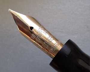 Photo of a pen produced by Eversharp. Model: Equi-Poised. Filling system: lever filler. In "Black and Pearl" celluloid. Detail of nib. First version, retired almost immediately.